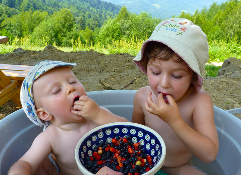 Gdyby ktoś miał wątpliwości, czy na Bucnik dociera lato (po półrocznej zimie rzeczywiście można się zastanowić;-) ) informujemy – lato przyszło i do nas. Jest wspaniały upał, przed domem wylądowała balia z wodą do kąpieli dla dzieci, poziomki dojrzewają na wyścigi z borówkami, a niedawno był wielki wysyp grzybów. Zajadamy się codziennie truskawkami na tysiąc sposobów, do spiżarki trafiło 20 kg truskawek w postaci dżemów i mrożonek.