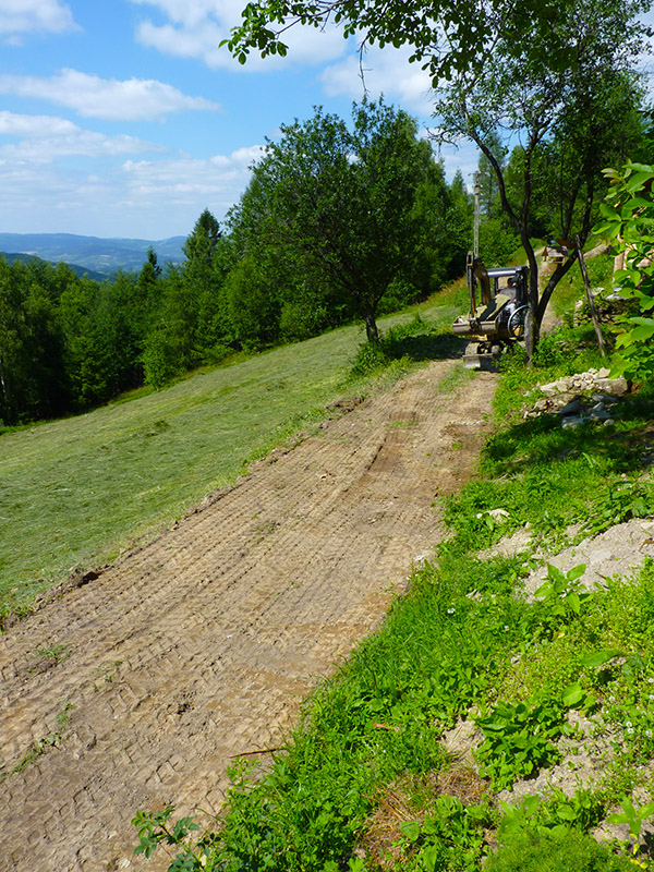 A to za sprawą wspaniałej zdobyczy techniki, jaką jest koparka! Po pierwsze, droga od ,,Równego"(parkingu, na którym najlepiej zostawić samochód osobowy) aż do przysiółku Piaski została porządnie wyrównana, gdzieniegdzie poszerzona, wywalcowana i teraz jeździ się nią jak autostradą :-) Kto pamięta te straszące skały na pierwszym ostrym podjeździe tuż za strumieniem, będzie mile zaskoczony, jak tam teraz pięknie i gładko. Po drugie, koparka podrównała kilka gorszych miejsc w dalszej części trasy od Piasków aż do nas, a obok naszego domu wryła się kawałek w górę i zrobiła zawrotkę dla samochodu, (znacznie bliżej niż przełęcz, na którą do tej pory jeździliśmy). Cieszymy się tym wszystkim ogromnie za każdym razem, jak gdzieś jedziemy.