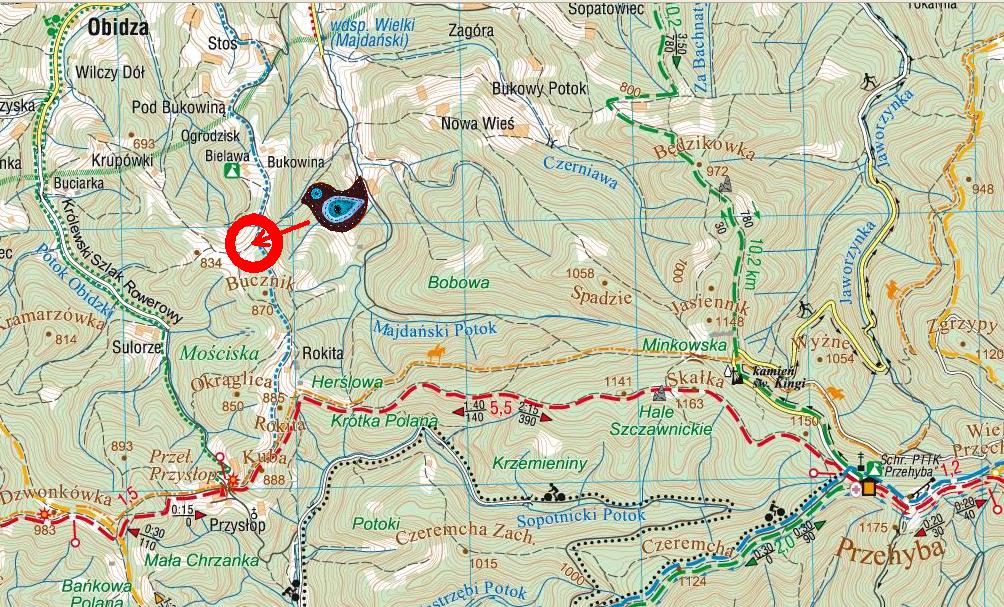 „Chata na Bucniku” - Beskid Sądecki, Obidza k. Jazowska (gmina Łącko, powiat nowosądecki), Pasmo Radziejowej, boczny grzbiet między Dzwonkówką a Skałką.